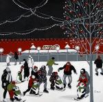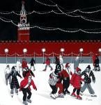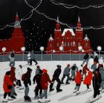 Работа выполнена в лаконичной декоративной манере. И изображает каток на Красной площади, рядом с известным торговым центром ГУМ.