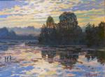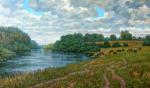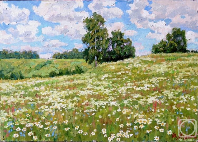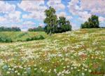 летний солнечный день, поле разнотравия, среди которого больше всего ромашек, по небу плывут лёгкие облачка.. .
