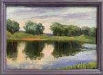 Деревья на дальнем берегу реки отражаются в тихой, спокойной глади реки.