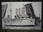Крейсер аврора «Аврора» совершает проход через разведённый Благовещенский мост на фоне Успенской церкви.