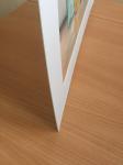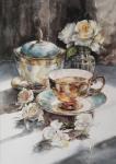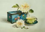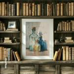 На картине застыла тихая поэзия стекла. Технику акварели хорошо передает сложную геометрию бликов и рефлексов на поверхности винтажных бутылок. Их цветовая гамма выстроена как музыкальный аккорд: от прозрачных серо-зеленых и аквамариновых тонов к густой холодной сини, которая оттеняет сияющую, наполненную светом желтую бутылку в центре. Композиция покоится на теплой поверхности стола с мягкими отражениями, а фон из светлого серого камня добавляет работе монументальности и спокойствия. Картина оформлена в белое паспарту 40х50 см.