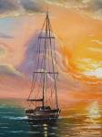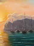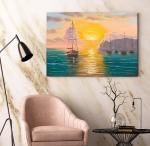 Эта романтическая картина изображает флотилию парусных яхт, плывущих по спокойному морю навстречу ослепительному закату. Солнце окрашивает небо в теплые оттенки оранжевого, розового и желтого, с легкими облаками и силуэтами гор на горизонте. Отражения в воде создают ощущение гармонии, покоя и приключений. Идеально для интерьера в морском стиле, гостиной или спальни, добавит тепла и вдохновения вашему дому.
