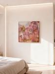 На картине изображен пейзаж, выполненный в абстрактной манере. Преобладают розовые и фиолетовые оттенки, создающие атмосферу мечтательности и легкости. В центре композиции можно увидеть отражение деревьев и неба в воде, что придает изображению глубину и объем. Стиль работы напоминает импрессионизм, с его характерными мазками и игрой света и тени.