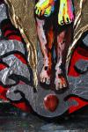 Натуральные камни: топаз (Бразилия) -место пробития копьем, Агат (Ботсвана) -голова Адама. Стразы Сваровски- места от гвоздей. Золотая и серебряная поталь. Рельефная паста. Флуоресцентные пигменты, масляные краски, защитные лаки.