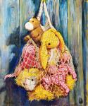 Мягкие, тронутые временем игрушки — кролик, пони, кукла — собраны в авоську и повешены на стену, как память. Это её вещи, её прошлое, с которым она только что мысленно попрощалась на берегу. Игрушки не выброшены — они сохранены бережно и с любовью. Картина наполнена светлой грустью и нежностью: ребёнок стал старше, но не разлюбил своё детство.