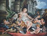 Ринальдо и Армида - герои поэмы «Освобожденный Иерусалим» итальянского поэта Т. Тассо (1544-95). Поэма посвящена первому Крестовому походу, завершившемуся захватом Иерусалима в 1099 г. и установлением христианского царства. Армида, красавица-колдунья, была послана Сатаной (поддержкой которого заручились сарацины), чтобы сокрушить крестоносцев силой своих чар. Она ненавидела Ринальдо и хотела отомстить ему за то, что он спас своих товарищей, которых она, подобно Цирцее, превратила в монстров. Однако, покоренная красотой Ринальдо, Армида влюбляется в него и уносит в свои зачарованные сады. На картине изображен знаменитый эпизод, в котором рассказывается о том, как воины, разыскивающие похищенного Армидой Ринальдо, находят влюбленных в садах Армиды. Армида вложила в руку Ринальдо зеркало (на картине зеркало держит, точнее подпирает своей спиной, один из амуров); влюбленные смотрят в глаза друг другу и при этом видят в зеркале свой собственный образ в момент любовного экстаза.