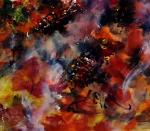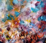 Перед зрителем — экспрессивная абстрактная композиция, наполненная динамикой и контрастами. Картина словно воплощает стихию природы, переплетающуюся с вихрем человеческих эмоций. Художник мастерски использует широкую палитру тёплых и холодных оттенков, создавая ощущение движения и пульсации жизни. Композиция картины символизирует движение, просачивание мысли/чувства изнутри наружу - проекция во вне.