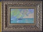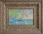 Этот натурный этюд художник написал с балкона отеля в Турунче в Турции находясь в тени и точно и живо изобразил тихий теплый прибрежный пейзаж. Картина, изображающая группу парусников, плавно покачивающихся на спокойном море нефритового оттенка, вызывает ощущение покоя и безмятежности. Художник искусно использует палитру прохладных зелёных и синих оттенков, плавно смешивая их, чтобы передать мерцающую текстуру залитой солнцем воды. Выше, пышный лесистый склон холма встречается с небом, написанным широкими, выразительными мазками, которые создают ощущение движения и глубины. Сочетание плотных земляных тонов с текучестью воды создаёт захватывающий визуальный контраст. Сложные детали, такие как отражения лодок, демонстрируют пристальное внимание художника к свету и перспективе, добавляя реалистичности и очарования сцене. Эта работа выделяется своей способностью передавать одновременно спокойствие и динамизм, приглашая зрителя в идиллическое морское путешествие.