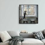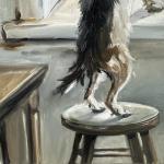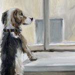На картине собака застыла в ожидании, встав на табурет так, будто несёт службу на своём маленьком посту. Она смотрит в окно с надеждой и преданностью, она ждёт возвращения хозяина. В её позе чувствуется внимание и тихая вера, что долгожданный момент встречи вот-вот настанет.