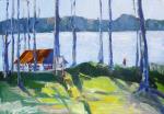 В этой работе я использовала тянущий грунт. Его особенность в том, что излишек масла из краски впитывается в холст, и поверхность получается бархатистои и матовои. А чтобы водная гладь все-таки заблестела, тут и там я разбросала золотистые блики солнца.