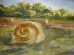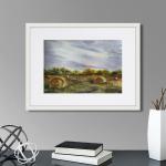 Оригинальная картина акварелью, сельский пейзаж, стога сена, картина в подарок