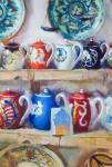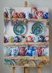 В одном из частных дворов Бухары действительно существует эта чудесная лавка: полки от пола до потолка, чайники, пиалы, статуэтки и ещё раз чайники. Совсем неудивительно, что любой памятник архитектуры был побеждён этим великолепием. На месте я сделала пару этюдов, а дома написала пару картин. Вот одна из них.