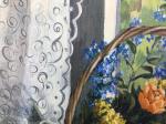 На подоконнике за отодвинутым тюлем стоит корзинка с букетом из купальниц, незабудок и других цветов. Из окна открывается вид на летний сад.