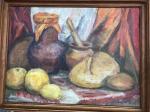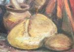 Деревенский натюрморт с глиняными горшками, хлебом и плодами.
