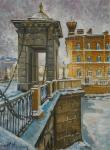 Раннее зимнее утро на канале Грибоедова. Человек с собакой прогуливаются вдоль канала.