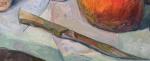 Натюрморт написан с натуры. Передаёт простой сельский быт. В натюрморте изображены колосья пшеницы, яйца, тыквы, чеснок, серп, нож
