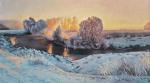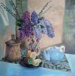 Букет сирени в стеклянной вазе. Вербы. Чайник, кадка с мёдом, лимон, киви.