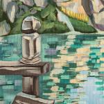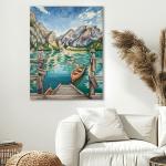 Спокойная картина дока на озере, на которой изображена деревянная лодка на воде с горами на заднем плане. Сцена включает лестницу, ведущую к озеру, вокруг которой плавают каноэ/ Голубое небо с белыми облаками и пышная зелень создают умиротворяющую атмосферу. Картина передает спокойствие природы.