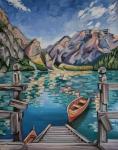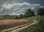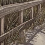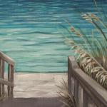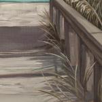 Картина маслом, изображающая дюны, ведущие к пляжу с морской травой и деревянными настилами, с видом на кристально-голубые воды. Небо чистое и светло-голубое, что создает безмятежную и гостеприимную атмосферу.