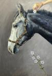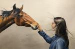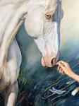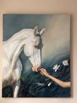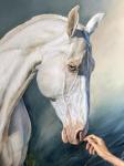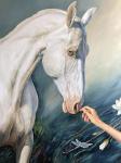 Однажды увидев этого белого коня, мне захотелось его представить в продолжении серии «соприкосновение». В красивой форме глаз- спокойствие, чуткость. Стать ахалтекинского коня иззабеловой масти, необычный цвет глаз,мне хотелось выделить на фоне изумрудного леса, пробуждения природы,цветения магнолии. Мне нравится в природе контраст насыщенных зелено-синеватых оттенков хвои, и белых хрупких весенних цветов. Они вторят большой фигуре лошади в свету и подчеркивают аккуратный жест руки человека, прикосновение.