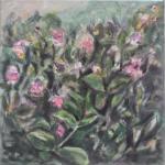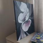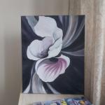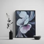 На картине изображены цветы. Они выполнены в мягких белых и розовых тонах, с плавными линиями и градиентами. Фон темный, что создает эффект контраста и подчеркивает нежность лепестков. Композиция выглядит динамичной, словно цветы разворачиваются, создавая впечатление движения. Общая гамма цветовой палитры создает атмосферу спокойствия и утонченности.