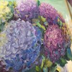 крупные пастозные мазки моделируют фактурные бутоны всеми любимых гортензий.