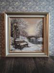 Картина "Первый снег" оформлена в багет с подставкой и подвесом, размер в раме: 25x25 см, без рамы: 20х20 см,