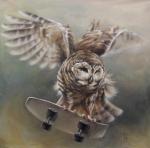 Одна картина из серии "Совы на колесах" где совы изображены на или с скейтбордами.