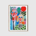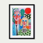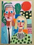 Это оригинальное акриловое произведение изображает выразительный портрет блондинки и мужчины с голубыми глазами в очках на фоне ярких кактусов. Вдохновлённая смелыми плоскими формами Анри Матисса, композиция сочетает простоту и экспрессивный цвет.