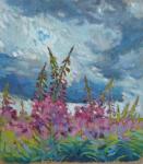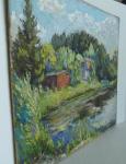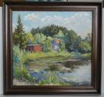 Картина “Домик у пруда” наполнена тихим, умиротворяющим настроением уходящего дня. В центре композиции - неподвижная гладь пруда, словно в зеркале отражающая нежные краски неба и силуэты окружающей природы. Вдоль его берегов растут густые травы, низкие кустарники и живописные деревья, некоторые из которых склоняют свои ветви к воде. На спокойной поверхности уже начали расползаться нежно—зеленые пятна ряски - они словно плывут навстречу друг другу, постепенно превращая зеркало пруда в живой ковер, в котором отражается заходящее солнце.Вдалеке, за береговой линией, виден небольшой, уютный на вид коттедж - он словно спрятался на опушке соснового леса, который возвышается стеной густых зеленых крон. Над всем этим простирается голубое небо, украшенное легкими облаками, но в его оттенках уже можно различить нежные золотисто-розовые отблески заката.