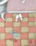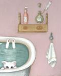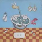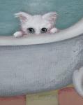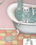 На холсте изображена ванная комната с розовыми стенами и клетчатым полом. В центре стоит белая ванна на изогнутых ножках, наполненная водой. Внутри сидят два белоснежных котика, а рядом угадывается ещё один хвост — будто в комнате есть невидимое присутствие.
