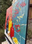 «Рябина и галка»- это выразительный натюрморт, наполненный символами, цветом и контрастом. На фоне насыщенных оттенков красного и морской волны раскрывается необычная композиция: ветка алой рябины, две глиняные бутылки- красная и желтея, и темная бутыль глубокого, почти черного цвета. На ней, словно хранитель тишины, сидит черна галка. На столе перед ними- тарелка с яркими, сочными лимонами, источающими солнечный свет.