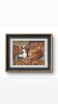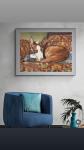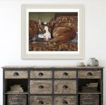 Картина выполнена в реалистичном стиле анималистического искусства. На ней изображена рыжеволосая собака с очаровательной белой мордочкой и нежно-розовым носом, мирно свернувшаяся уютным клубочком на красивом цветастом диване. Игра света и фактуры подчеркивает теплоту меха животного и мягкость ткани, передавая ощущение комфорта, нежности и тихого счастья. На картине запечатлен трогательный повседневный момент — безмятежное довольство любимого питомца, отдыхающего в своем любимом месте.