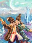 Вечера на хуторе" — это очаровательное произведение в стиле наивного искусства, написанное маслом на холсте. Эта небольшая картина переносит зрителя в мир Гоголевских сказаний, где казак Чуб и его кум отправляются в гости, невзирая на метель и другие злоключения. Яркие цвета и выразительные фигуры делают работу живой и запоминающейся, а её простота и искренность вызывают теплую улыбку.