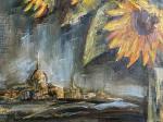 Эта картина появилась вскоре после моего дня рождения, когда мне подарили букет живых садовых подсолнухов. Не идеальных и одинаковых — а настоящих, тёплых, со своим характером, все как я люблю. Я поставила их в хрустальную вазу, и отражения света в гранях стекла усилили ощущение солнечной полноты момента.