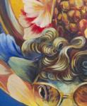 В центре картины – могучий Телец, написанный выразительными, размашистыми мазками, которые подчёркивают силу и харизму. Его голову венчает причудливая корона из ананаса, тропических цветов и пышной зелени, символизирующая изобилие, чувственность и природу – классические черты знака Тельца.