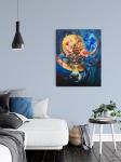 За быком, словно солнце, сияет сияющий золотой шар, омывая персонажа тёплыми жёлтыми и оранжевыми оттенками. Этот тёплый свет резко контрастирует с окружающими глубокими синими, индиго и бирюзовыми тонами, вызывающими ассоциации с космическим ночным небом. В левом нижнем углу изящное созвездие Тельца, расписанное звездными точками, прочно связывает композицию с астрологическим миром.
