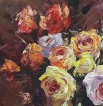 Элегантный натюрморт, выполненный маслом на оргалите, пленяет гармонией тёплых и нежных оттенков. В центре композиции — пышный букет роз в изящной голубой вазе. Автор мастерски передал разнообразие оттенков: от солнечно-жёлтых и кремовых до нежно-розовых и насыщенно-красных. Несколько роз лежат на столе, добавляя композиции непринуждённую естественность.