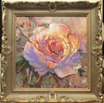 Изящный натюрморт маслом, исполненный в свободной, экспрессивной манере. В центре композиции — роскошный пион, написанный с особой тщательностью: мягкие переливы розовых, кремовых и сиреневых оттенков создают ощущение бархатистой текстуры лепестков. Тёплые золотистые блики в сердцевине цветка добавляют работе глубины и выразительности.