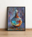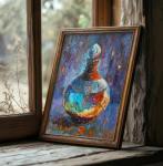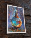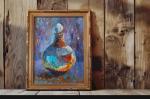 В колбе — голубая субстанция, которая пульсирует и светится изнутри. Рядом горят свечи, уводя взгляд в мистическую глубину. Пастозные мазки фиолетового, оранжевого и голубого создают вибрацию, превращая обычный натюрморт в сцену алхимического действа. Это живопись о скрытой энергии, о магии, которая становится материальной. Работа балансирует на грани абстракции и фигуративности, приглашая зрителя к расшифровке символов. Для кабинета в стиле арт-деко, для коллекционеров фантастики и ценителей эмоционального, загадочного искусства.