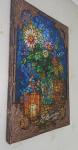Работа выполнена акрилом на фанере толщиной 4 мм. и представлена как завершённый живописный объект. Композиция построена, как имитация витража:цветовые фрагменты формируют образ букета освещённого мягким светом горящей свечи. Свет становится ключевым выразительным элементом, объединяющим пространство и создающее ощущение внутренней сосредоточенности.Работа выполнялась на фанере толщиной 4 мм и закреплена на жёстком подрамнике глубиной 5 см.Авторская рельефная рама создана вручную с использованием текстурной пасты и имитирует кованую медь , усиливая ощущение материальности и объектности произведения.Картина существует как самостоятельный арт-объект и не требует дополнительного оформления.