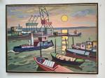 Вечер, закат солнца, лодки на приколе, старый буксир проплывает мимо уснувших портовых кранов, покой, тишина, тихая вода