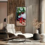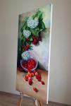 Картина маслом на холсте "52 Черешни", размер высота 100 см х ширина 50 см. Холст на подрамнике. На картине изображен натюрморт с ягодами черешни и цветами гортензии. Яркая и сочная картина станет акцентом в интерьере дома.