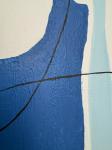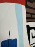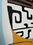 • Фон и детали: Задний план состоит из вертикальных черных линий на белом фоне. Над верхней фигурой расположено оранжевое солнце или полумесяц. Нижняя фигура находится на большом красном фоне и частично покрыта тканью с белыми точками и голубой тканью с круговым узором.