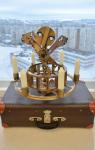 Светильник изготовлен из чугунного литого тройника с фланцами, деревянное основание установлена на металлическую вращающуюся подставку.