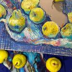 Простые вещи, которые радуют глаз и греют душу. Сочные желто-зеленые груши на ярко-синей драпировке. Натюрморт выполнен в традициях импрессионизма: активно используется оптическое смешение и форсирование (усиление) цвета.