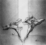 Две ломаные формы, образующие некий ритмичный, графический диалог, на фоне белого портала света.