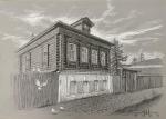 "Дом с мезонином." Из серии "Деревянное зодчество г. Ногинска." Тонированная бумага, гуашь, цветные карандаши. Размер: 30х40см. 2025г.