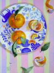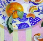 Я люблю натюрморты с цитрусами. Здесь я обратила внимание на контрасты оранжевого и синего цветов. Это красивый дуэт.