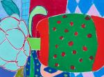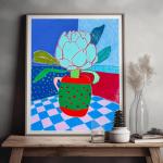 Этот оригинальный рисунок масляной пастелью изображает очаровательный натюрморт с артишоком, помещённым в красно-зелёную вазу в горошек, стоящую на клетчатой скатерти. Композиция разворачивается на фоне насыщенного синего цвета с мягкими пастельно-розовыми акцентами. Вдохновением для работы послужили смелые цветовые решения и плоские формы Анри Матисса, объединённые с теплотой и простотой иллюстраций детских книг.